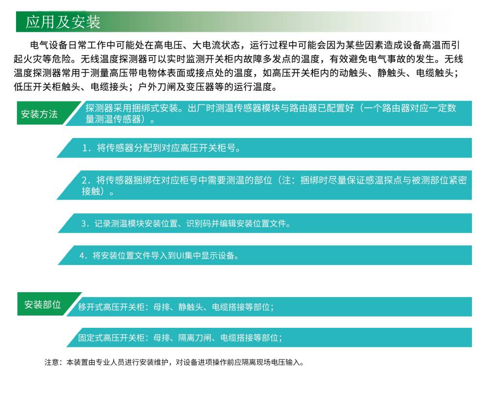 運(yùn)行中的電氣系統(tǒng)用戶(包括高低壓配電柜用戶)需要一套預(yù)警系統(tǒng),對(duì)各種原因?qū)е碌漠惓5臏囟壬?,進(jìn)行實(shí)時(shí)監(jiān)測,比如斷路器下的接點(diǎn)處,高壓觸頭處的溫度進(jìn)行監(jiān)測,并將溫度數(shù)據(jù)實(shí)時(shí)的上傳,并能夠通過手機(jī)等方式接收到報(bào)警信息,及時(shí)處理,從而避免火災(zāi)事故的發(fā)生。